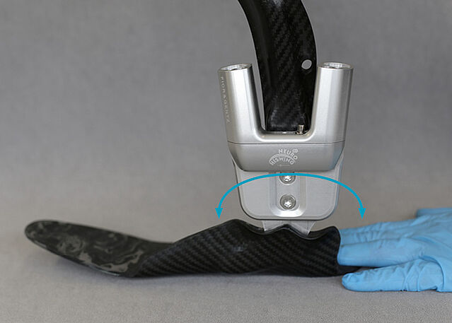 In order to adjust the orthosis alignment with a NEURO HiSWING R+, place the orthosis in the orthosis shoe that your patient will use later. Establish the correct orthosis alignment with the help of a plumb bob. Later, the basic position will be saved in the Expert app once.
