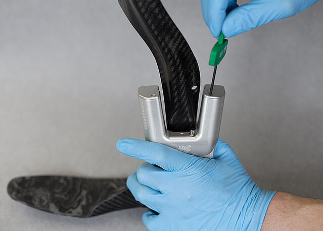 Bring the system joint in plantar flexion/dorsiflexion. Mounted spring units should move by compression only. At a high spring force, it is impossible to cause any movement manually. If the system joint still runs idle, carefully screw the posterior alignment screw further in.