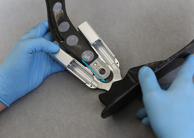 Adhere the connection cable with a small amount of medium-viscous fast-acting adhesive to the area on the lower leg shell created by the lamination dummy for the connection cable and the lamination dummy for the cable length compensation.
