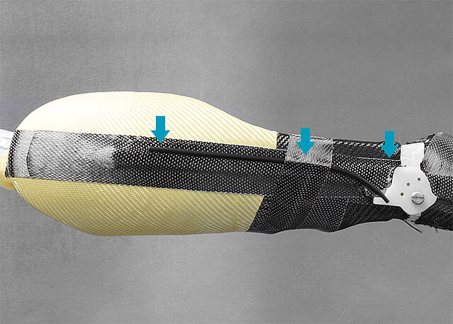 Place the cable cover anteriorly along the system string. It should end as high as possible in order to enable an optimum force transmission. Secure the cable cover with unidirectional carbon fibre band.