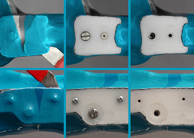 Entfernen Sie die dünne Laminatschicht über den Montage-/Gießdummys mit einem scharfen Messer. Entfernen Sie die Schrauben.
