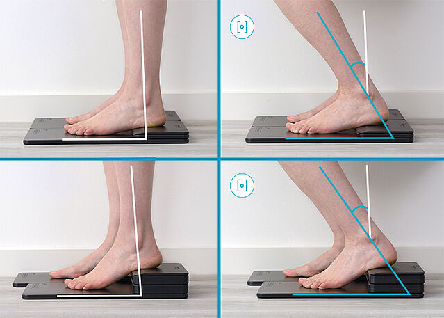 Die Bewegungsfreiheit im OSG in Dorsalextension wird aus der individuellen Grundstellung heraus gemessen. Stellen Sie den Patienten unter Berücksichtigung des Beinlängen-/Höhenausgleiches und der Schuhsprengung auf das h-Cast. Messen Sie ausgehend von der individuellen Grundstellung die Bewegungsfreiheit des oberen Sprunggelenkes in Dorsalextension.